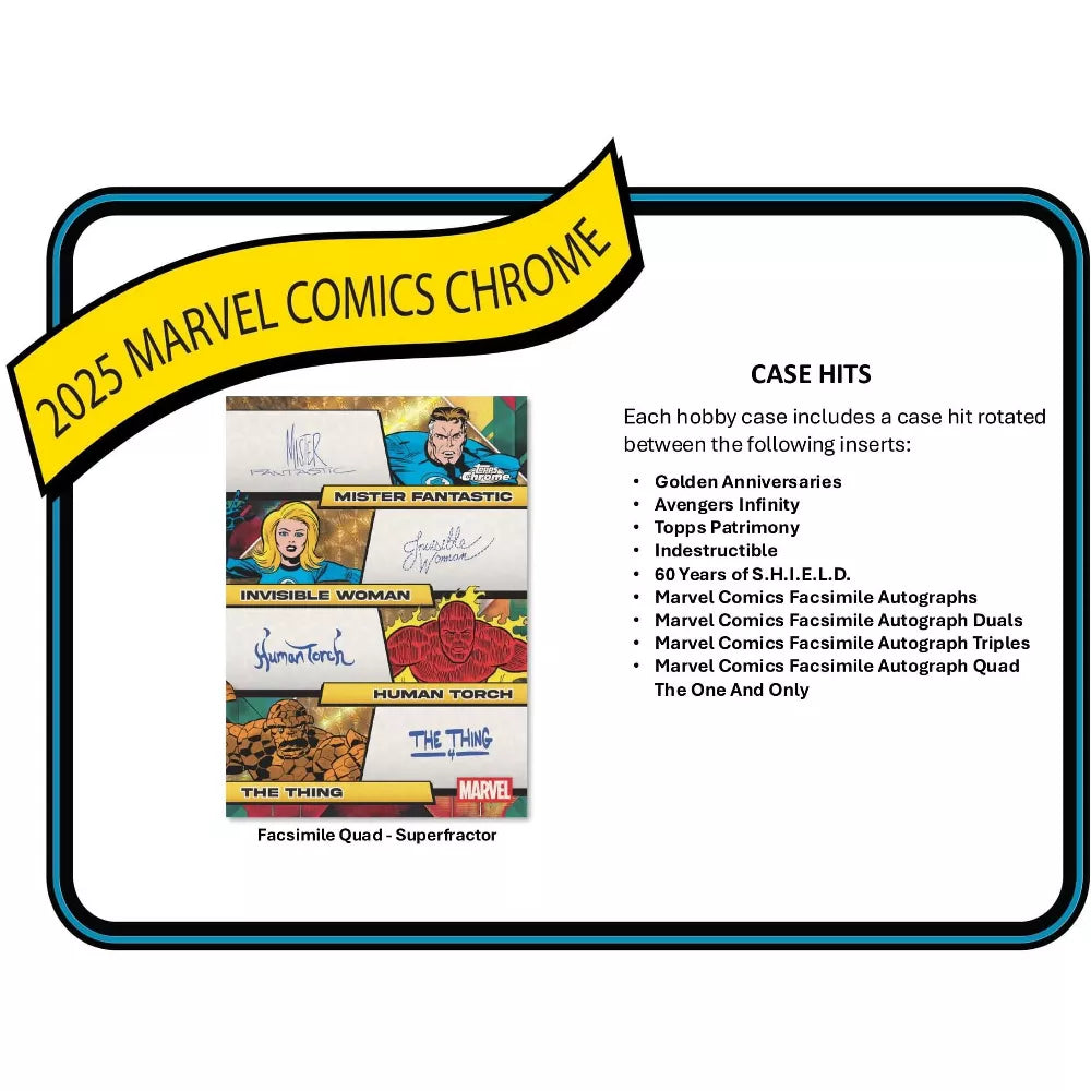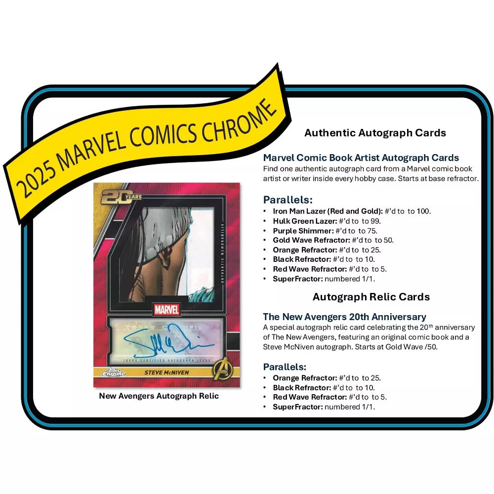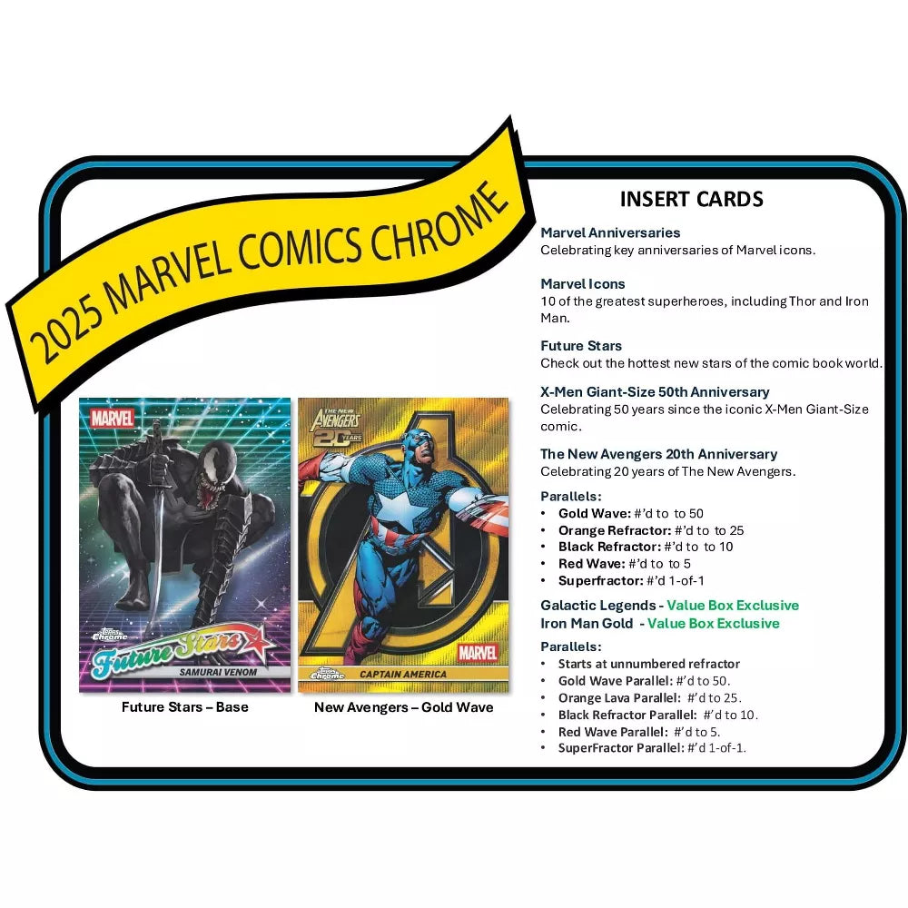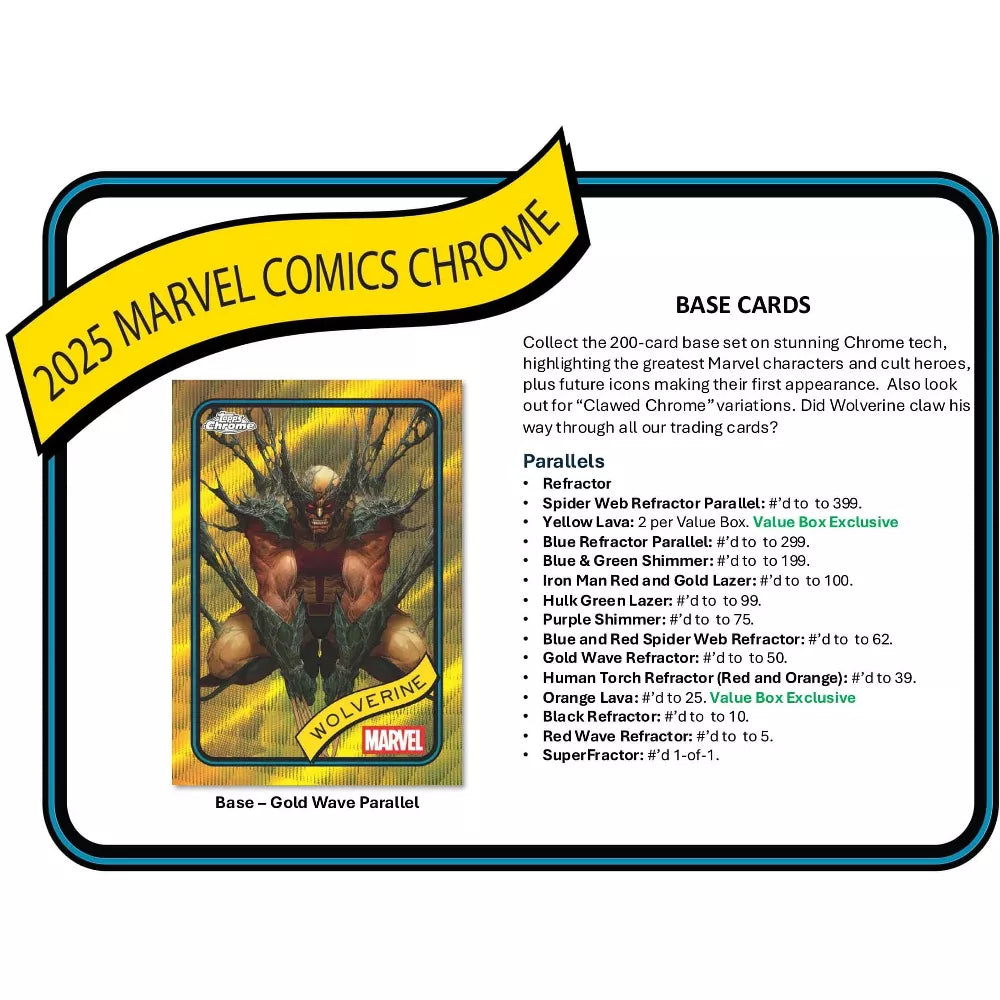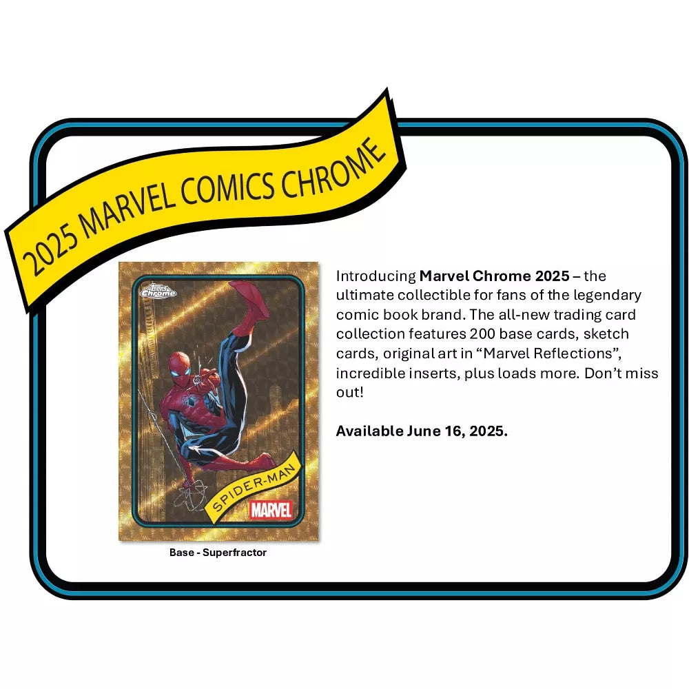 Introducing Marvel Chrome 2025 – the ultimate collectible for fans of the legendary comic book brand. The all-new trading card collection features 200 base cards, sketch cards, original art in “Marvel Reflections”, incredible inserts, plus loads more. Don’t miss out! 2025 Topps Marvel Comics Chrome Value Box Hits: (2) Yellow Lava Parallels (1) Iron Man Gold (2) Base Refractor Parallels 7 packs per box, 4 cards per pack