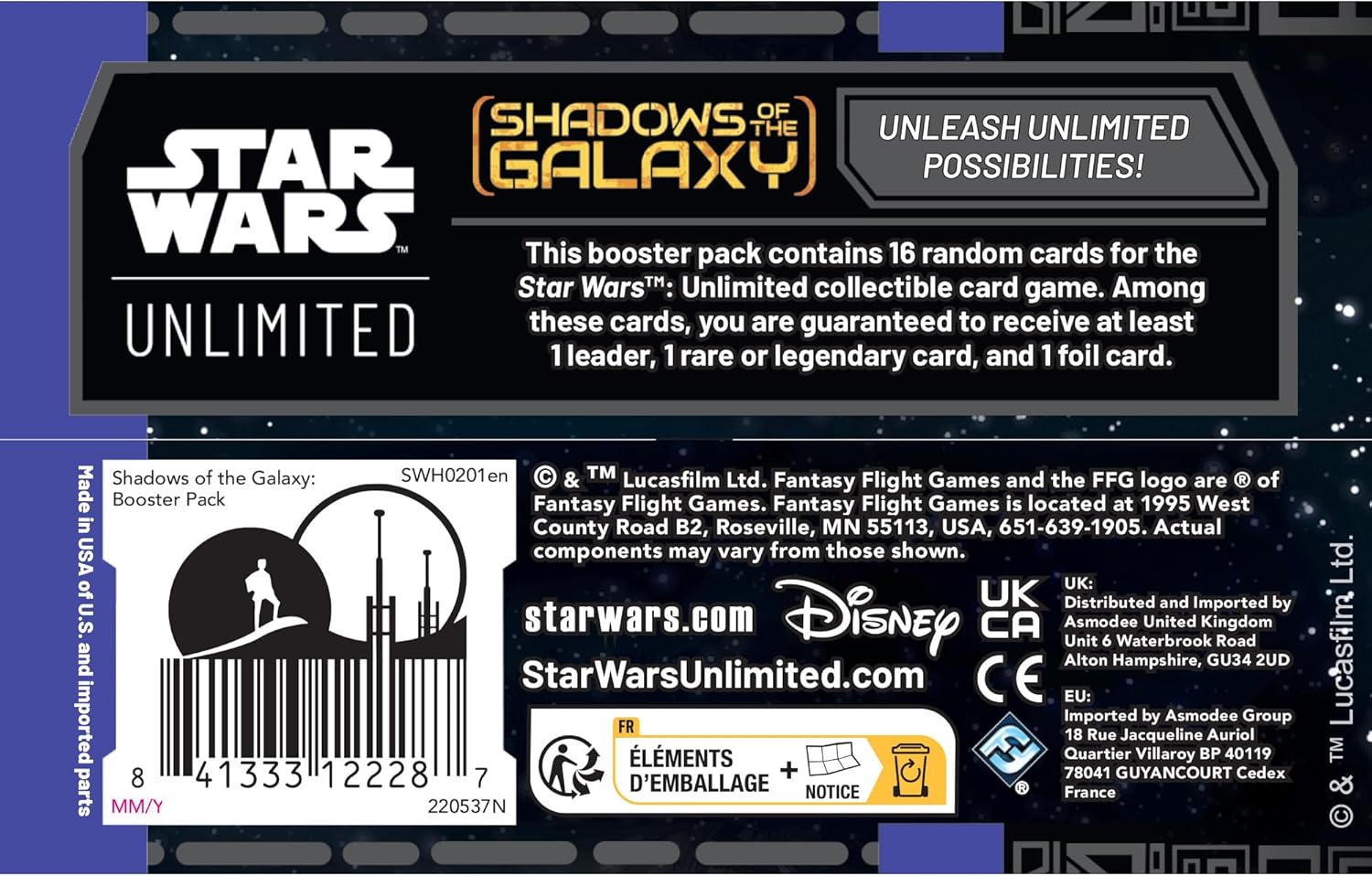 - Dive into the Star Wars universe with 24 booster packs from the Shadows of the Galaxy set, featuring characters and content from The Mandalorian, Solo, The Book of Boba Fett, and more!